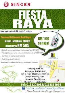 SINGER Fiesta Raya Special Promotion is on with offers on sewing items! So check out SINGER Fiesta Raya Special Promotion while the sale offer still lasts.When: 11 & 12 August 2012(Sunday)